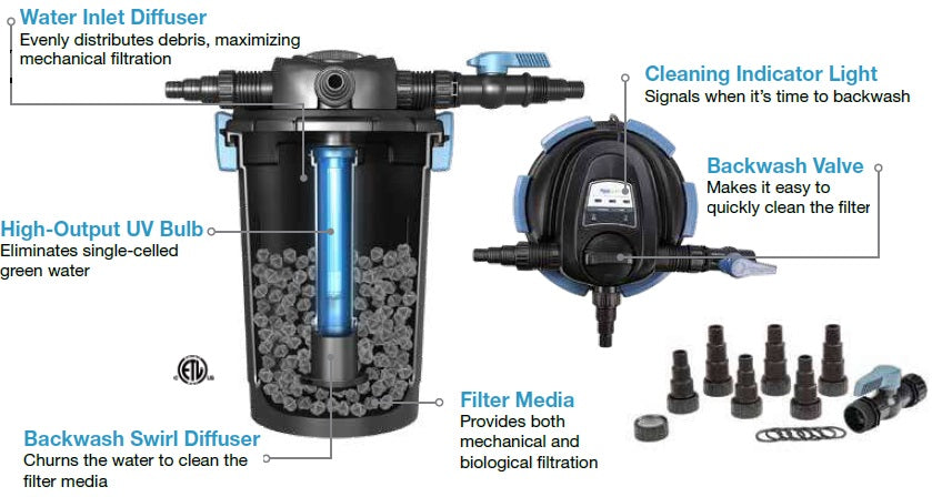 The high-output UV bulb eliminates single-celled algae which causes single-celled algae (suspended algae) blooms. A bulb-saver timer feature saves bulb life and provides an ideal time to add water treatments. The simple-to-use self-cleaning feature allows for the unit to be backwashed in less than five minutes without opening the canister or getting your hands dirty. A cleaning indicator light will automatically remind you when the filter requires backwashing. Aquascape UltraKlean™ Pond Filters come complete with all necessary fittings and carries a 3-year limited warranty.
